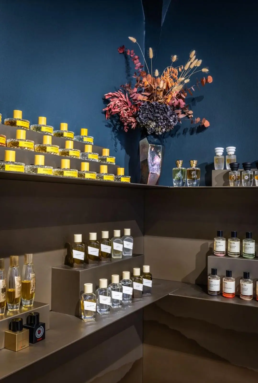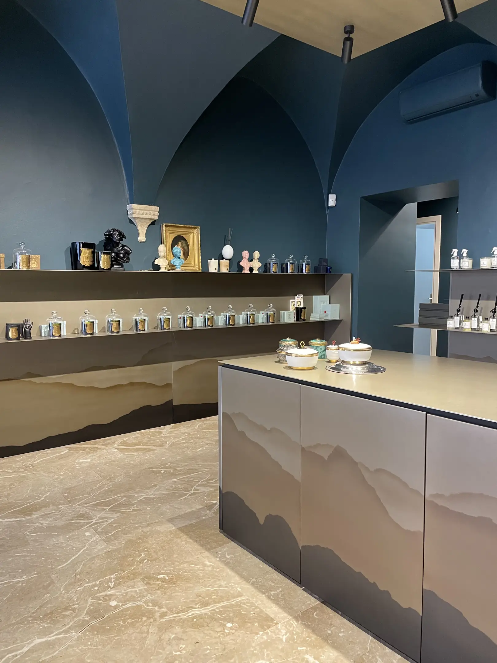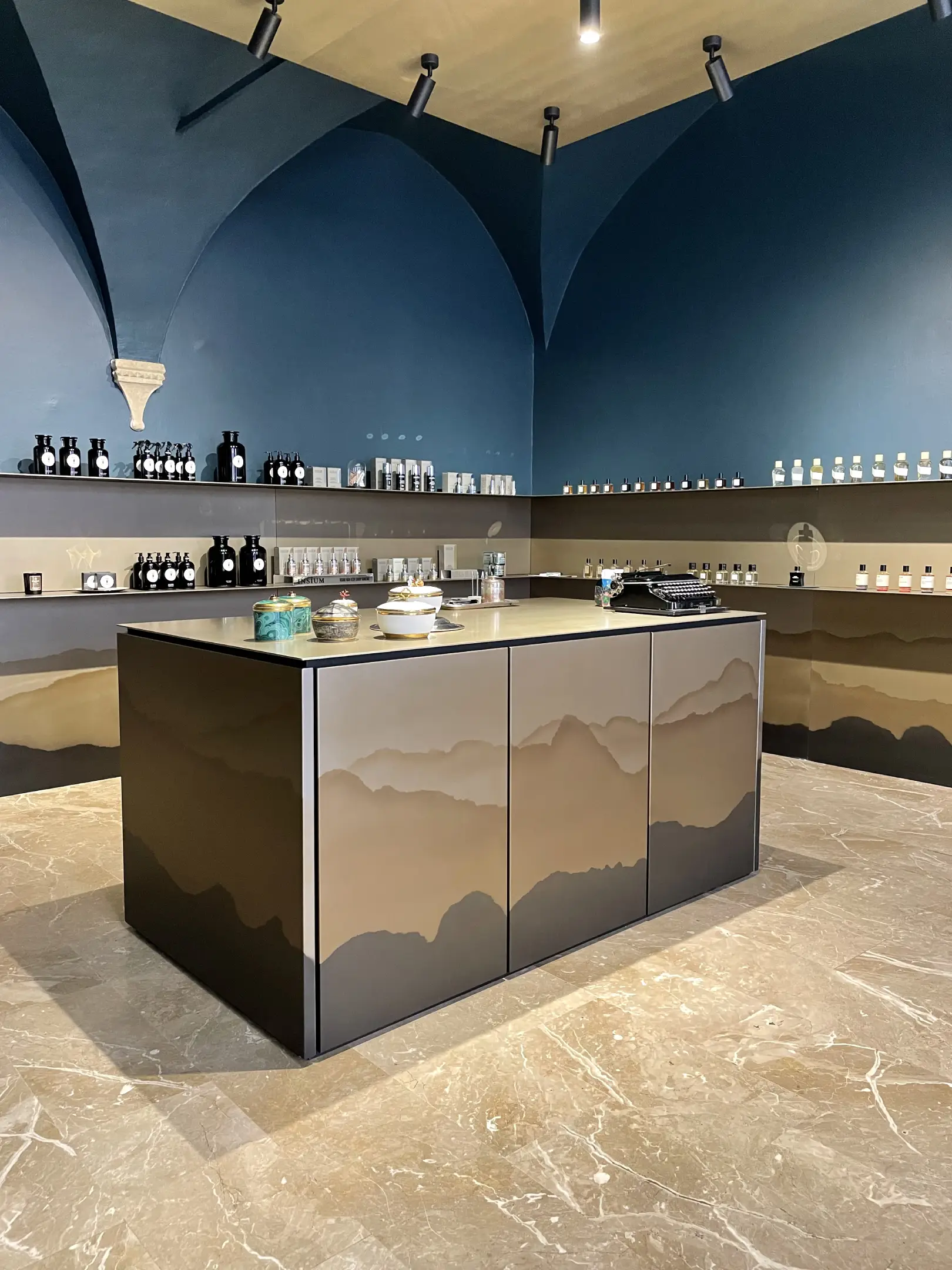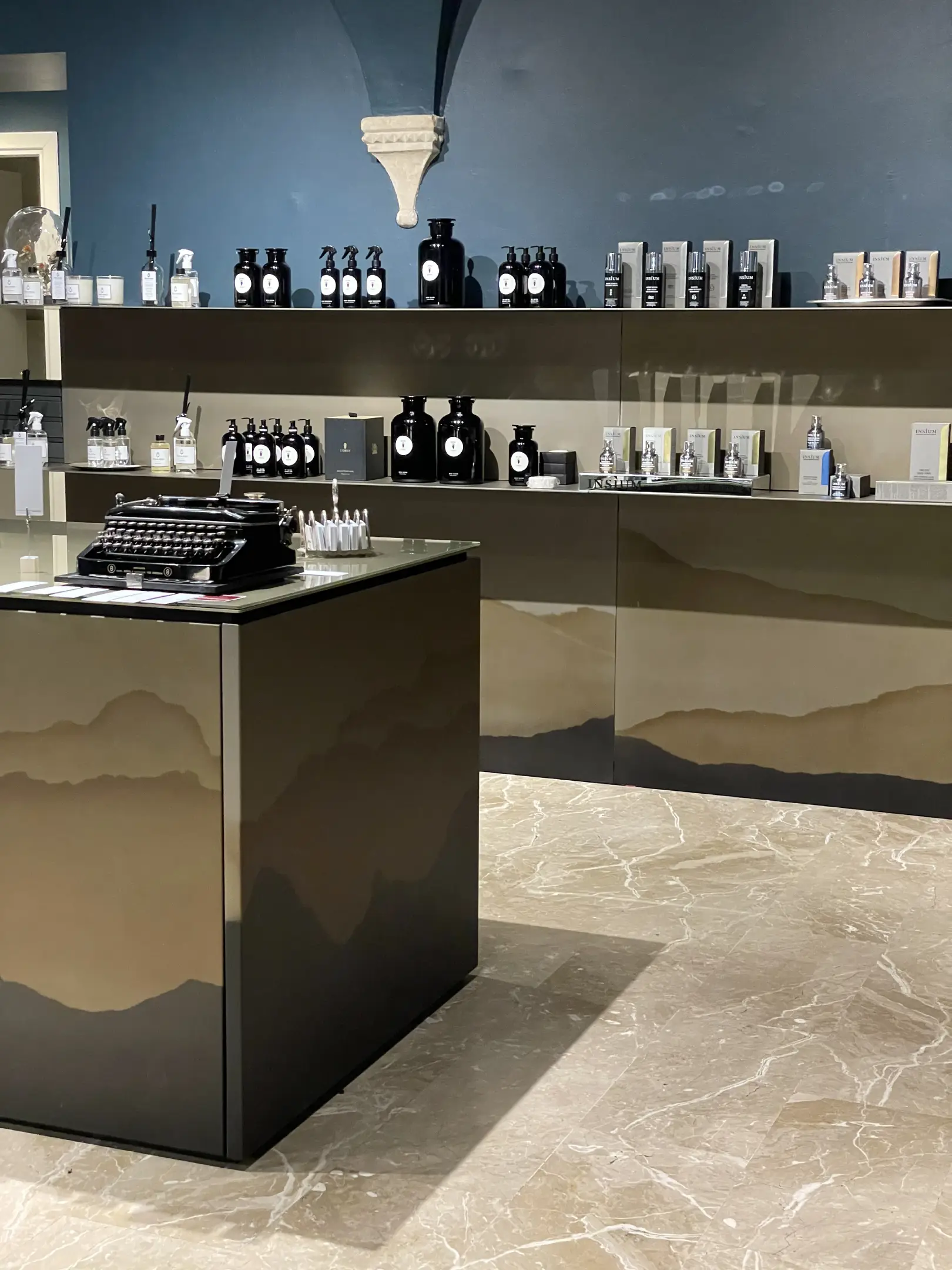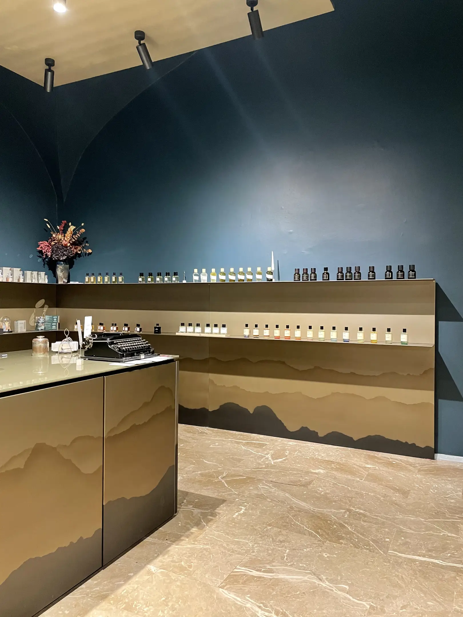 The result is an environment that embodies the pursuit of excellence typical of niche perfumery, where craftsmanship, design, and authentic materials come together to deliver a high-level aesthetic and sensory experience.